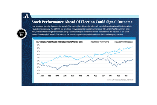 Our analysis suggests the 2020 presidential race is still up in the air. If the economy continues to open up, a vaccine is on the way, and the massive stimulus continues to drive asset prices higher, President Trump’s chances may improve. A weak economy struggling to come out of recession and weaker markets would likely favor challenger former Vice President Joe Biden.