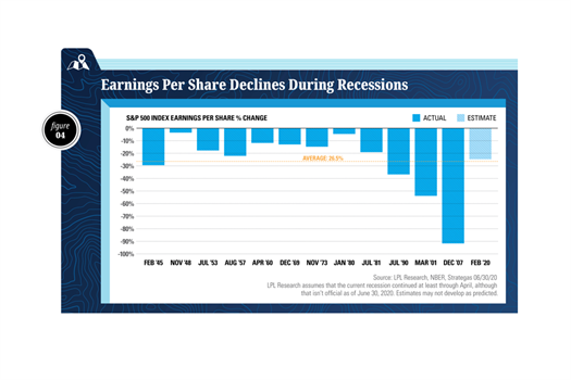 Our S&P 500 earnings forecast for 2020 is $120 to $125 per share. At the midpoint, earnings would drop about 25% from 2019’s level of $163, roughly in line with the average historical decline in recessions [Figure 04]. This forecast reflects: 1) the severity of the decline in economic activity in March and early April, 2) the initial snapback in activity after many states began to reopen beginning in mid-April, and 3) growth headwinds that will constrain the trajectory of the recovery later this year.